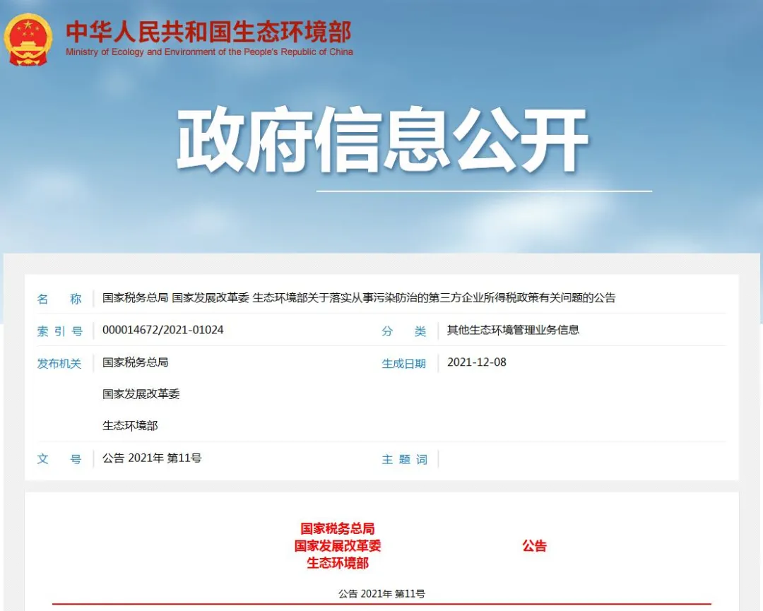 國家稅務總局 國家發展改革委 生態環境部關于落實從事污染防治的第三方企業所得稅政策有關問題的公告